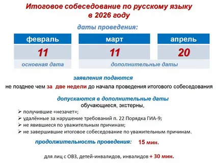 Регистрация участников заканчивается за две недели до даты проведения итогового собеседования.